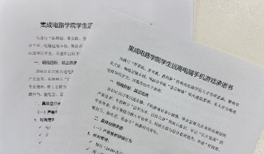 多措并行:以“规”束行,以“诺”践心,以“我”修身,以“体”砺,无论是《学生“芯”规》的制度划定,还是《远离电脑手机游戏承诺书》的主动约定,核心目标始终一致——引导“芯青年”远离干扰、专注学业,以实际行动践行“芯片报国”的使命。集电学子正以“芯”规为行为标尺,以承诺为自律动力,主动减少游戏时间、聚焦专业学习,在课堂上认真思考、在实验室里钻研创新,在“芯火相传、强基铸魂”的育人氛围中,为未来投身集成电路事业、助力国家科技自立自强筑牢根基。